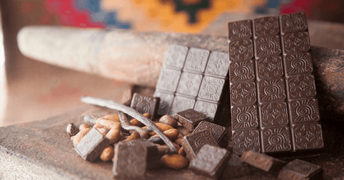Tablettes de chocolat – fèves de cacao – gousse de vanille – posées sur le metate